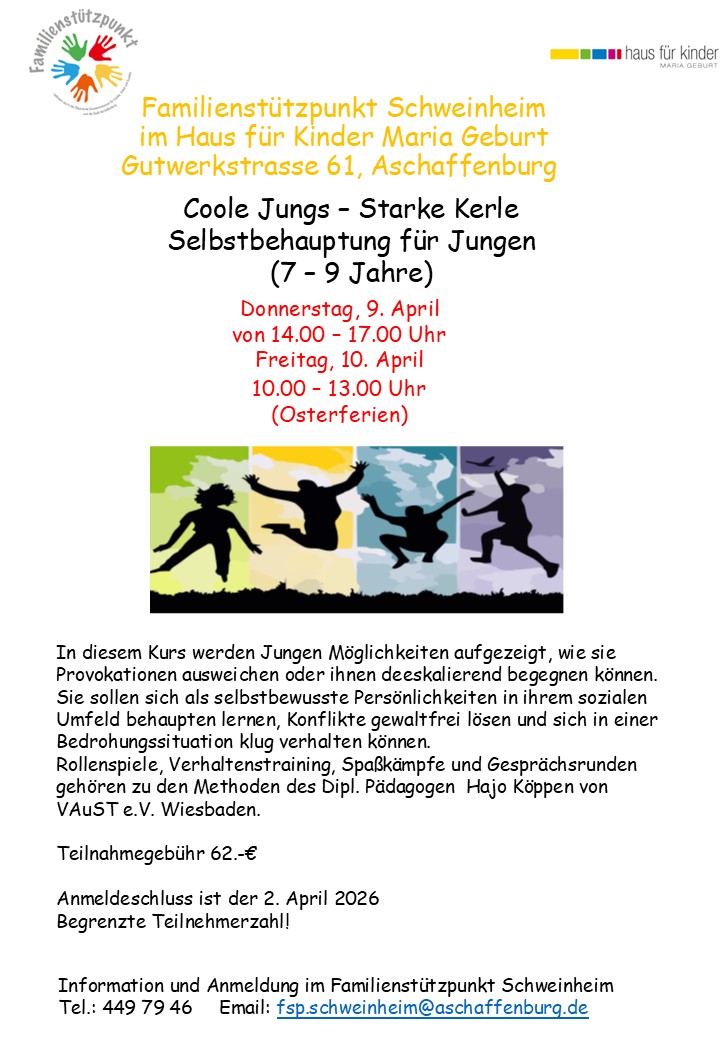 09Apr14:0017:00Coole Jungs - Starke KerleSelbstbehauptungskurs für Jungen von 7 - 9 Jahren in den Osterferien14:00 - 17:00(GMT+02:00)