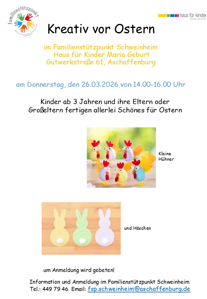 26Mär14:0016:00Kreativ vor OsternKleine Hühner und Hasen basteln Kinder ab 3 Jahren und eine erwachsene Bezugsperson14:00 - 16:00(GMT+01:00)